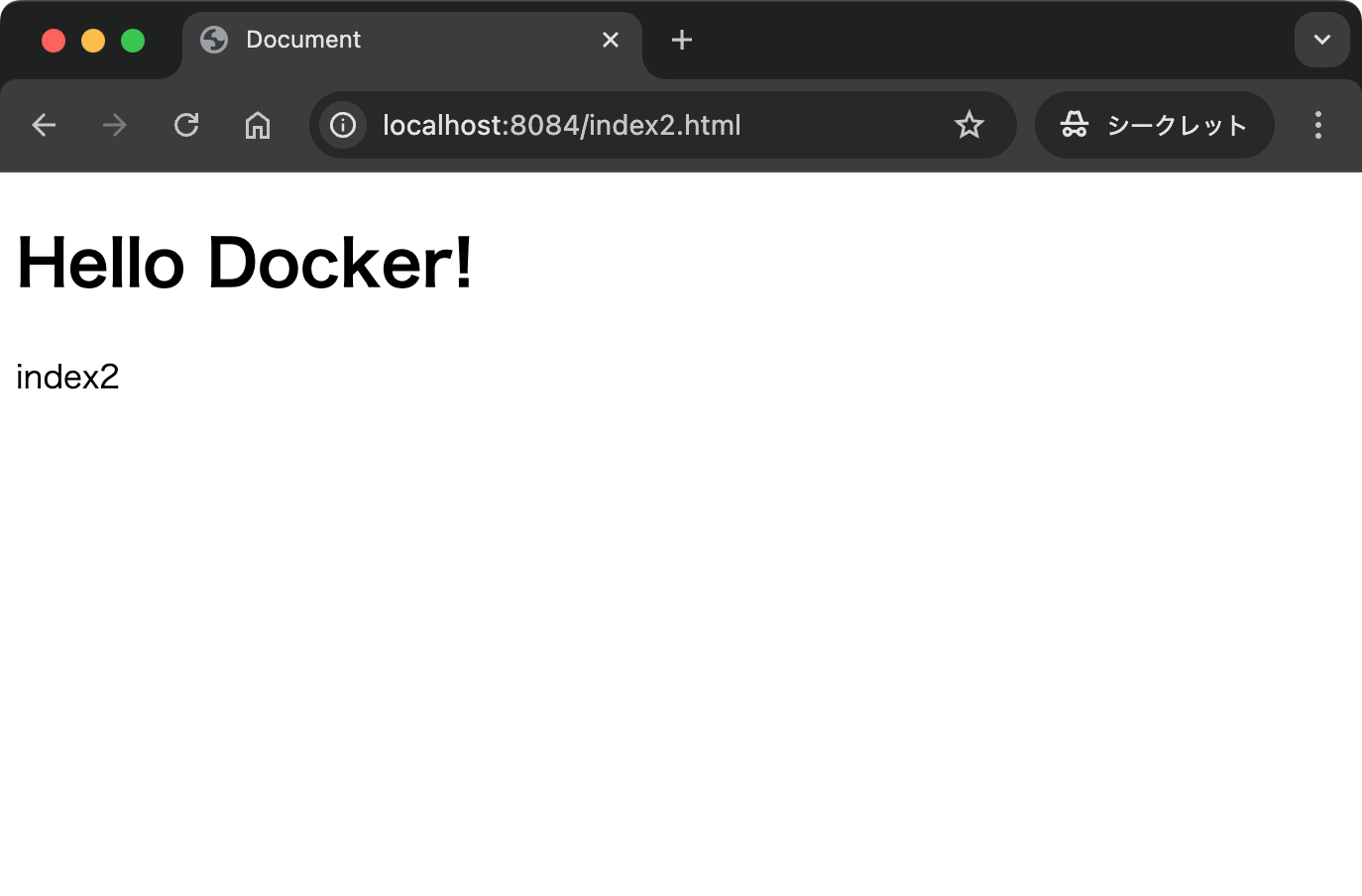 Web ブラウザを起動し http://localhost:8084/ と http://localhost:8084/index2.html に接続します.ローカル環境で作成した index.html や index2.html の内容が閲覧できることを確認します.さらに,ローカル環境でファイルを編集して Web ブラウザで再読み込みすると,直ちにその編集が表示結果に反映されることに注意してください.