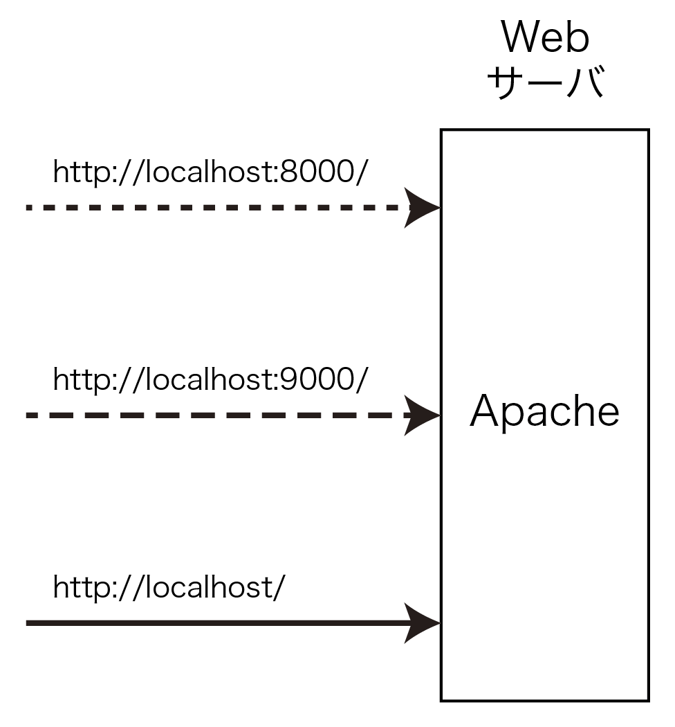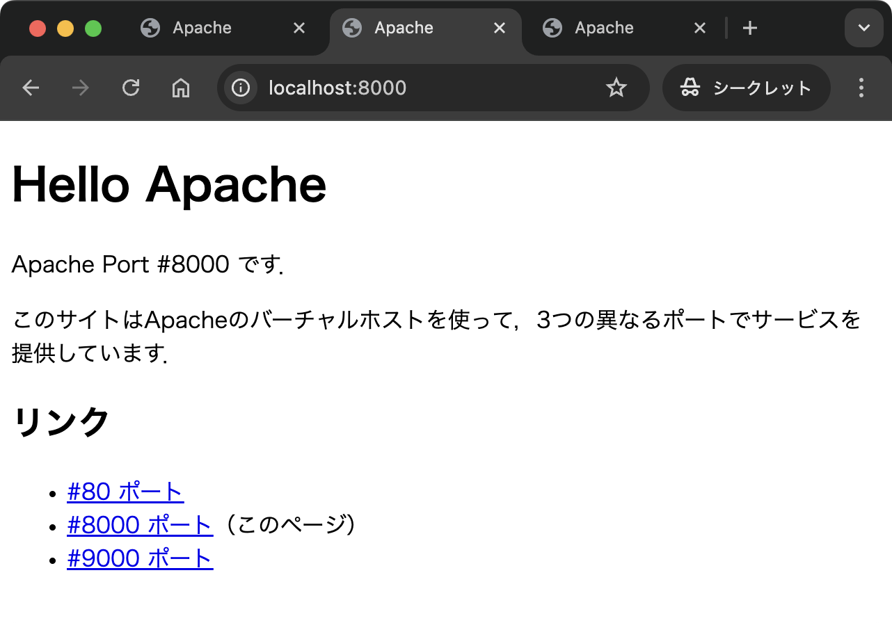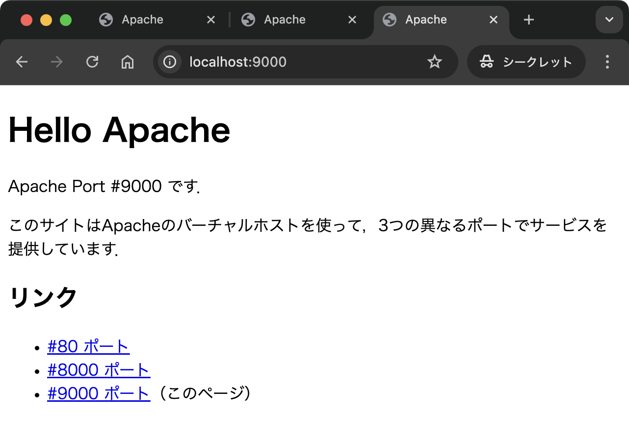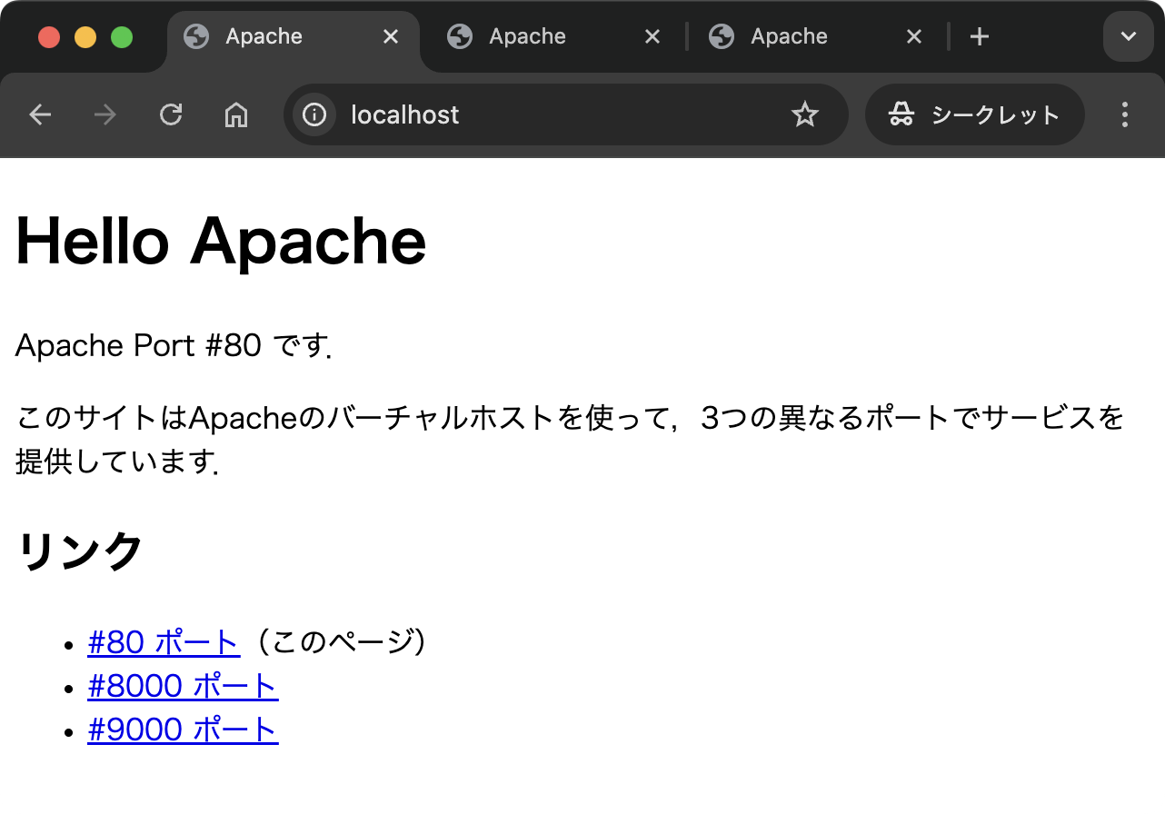 通常の Web サービスは HTTP では TCP 80 番ポート,HTTPS では 433 番ポートというウエルノウンポート番号を使って提供されます.ここでは,80 番ポート以外にも 8000 番ポートと 9000 番ポートという3つの異なるポートで異なるサービスを提供することを考えます.具体的には Apache のバーチャルホストという機能を利用して,http://localhost:80/ と http://localhost:8000/ および http://localhost:9000/ とで3つのサービスを提供する例を作成します.なお,このページのサンプルコードは GitHub の web03Apache フォルダで公開しています.