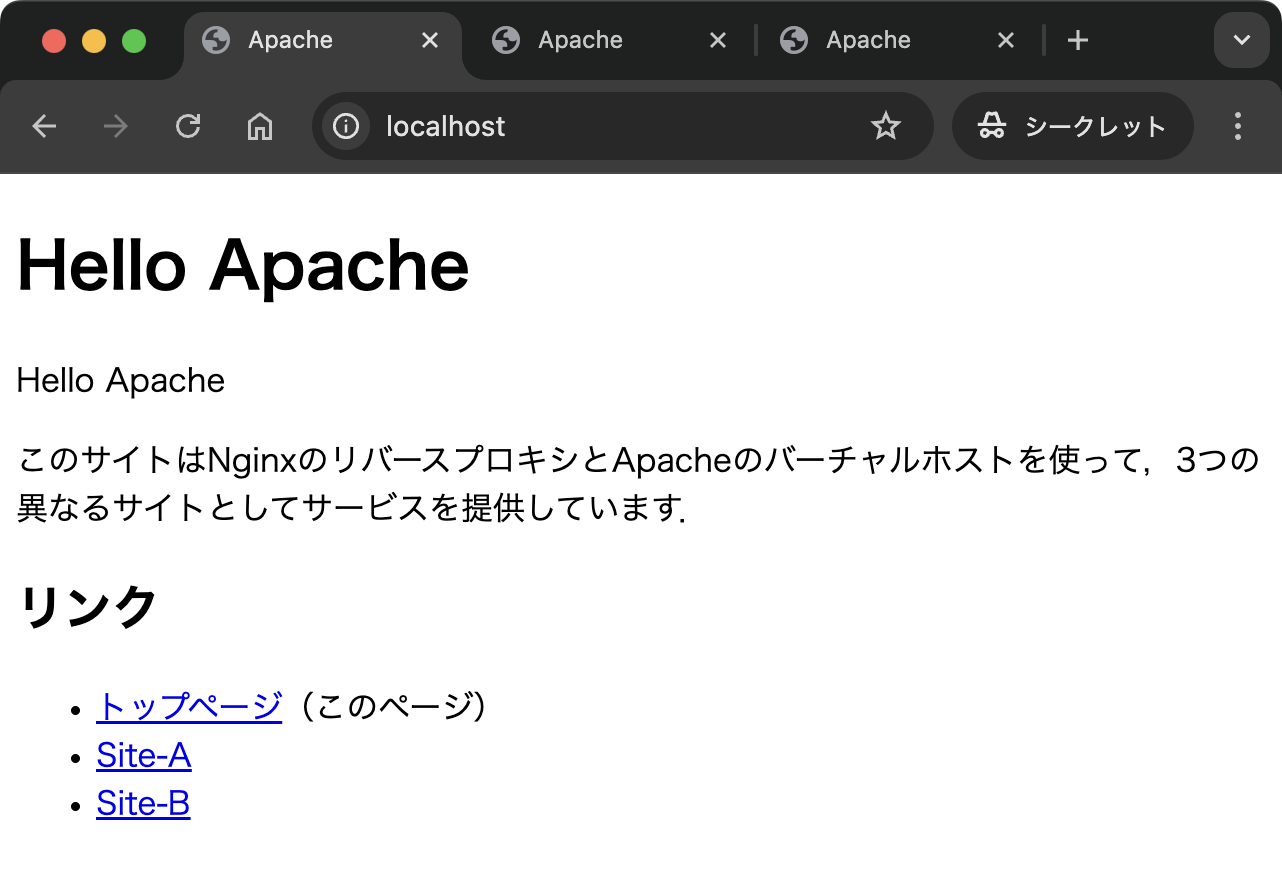 コンテナが起動できたので,Web ブラウザで http://localhost/ にアクセスします.ブラウザからのリクエストは nginx のリバースプロキシを経由して apache のバーチャルホストへ転送されていることに注意してください.