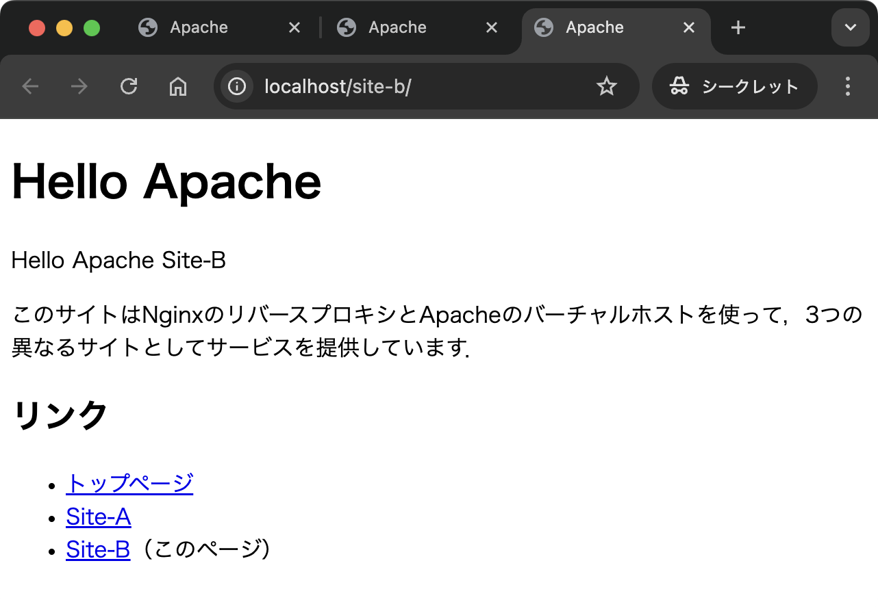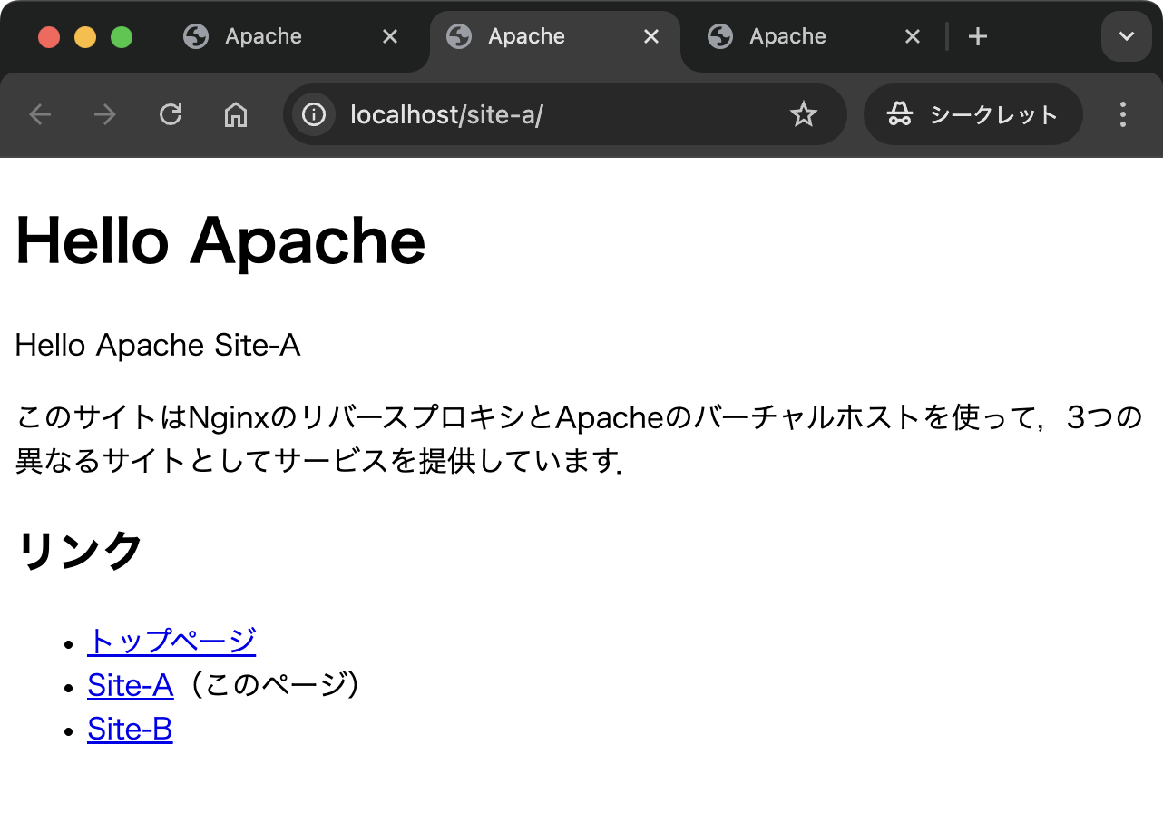 次に,http://localhost/site-a/ や http://localhost/site-b/ にアクセスします.