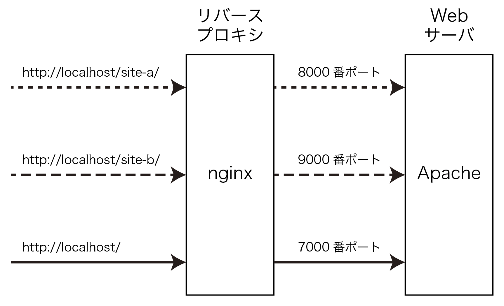 と一致させていることに注意してください.同じように,13行目からのブロックでは http://localhost/site-b/ 以下の HTTP リクエストを apache サービスの 9000 番ポートに転送し,21行目からはそれ以外の HTTP リクエストを 7000 番ポートに転送する設定としています.