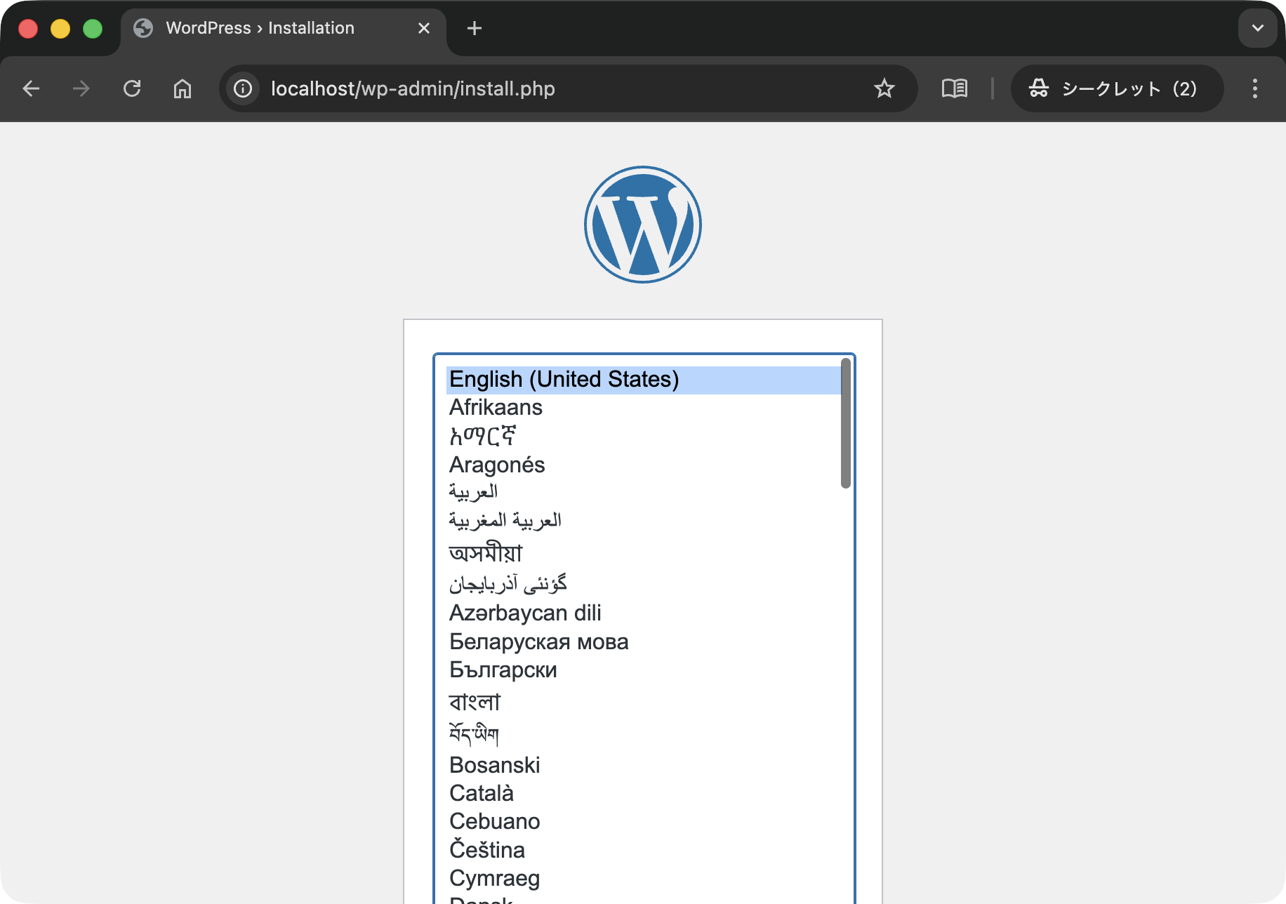 Webブラウザで http://localhost/ にアクセスします.初めての接続なので言語の設定画面が表示されます.