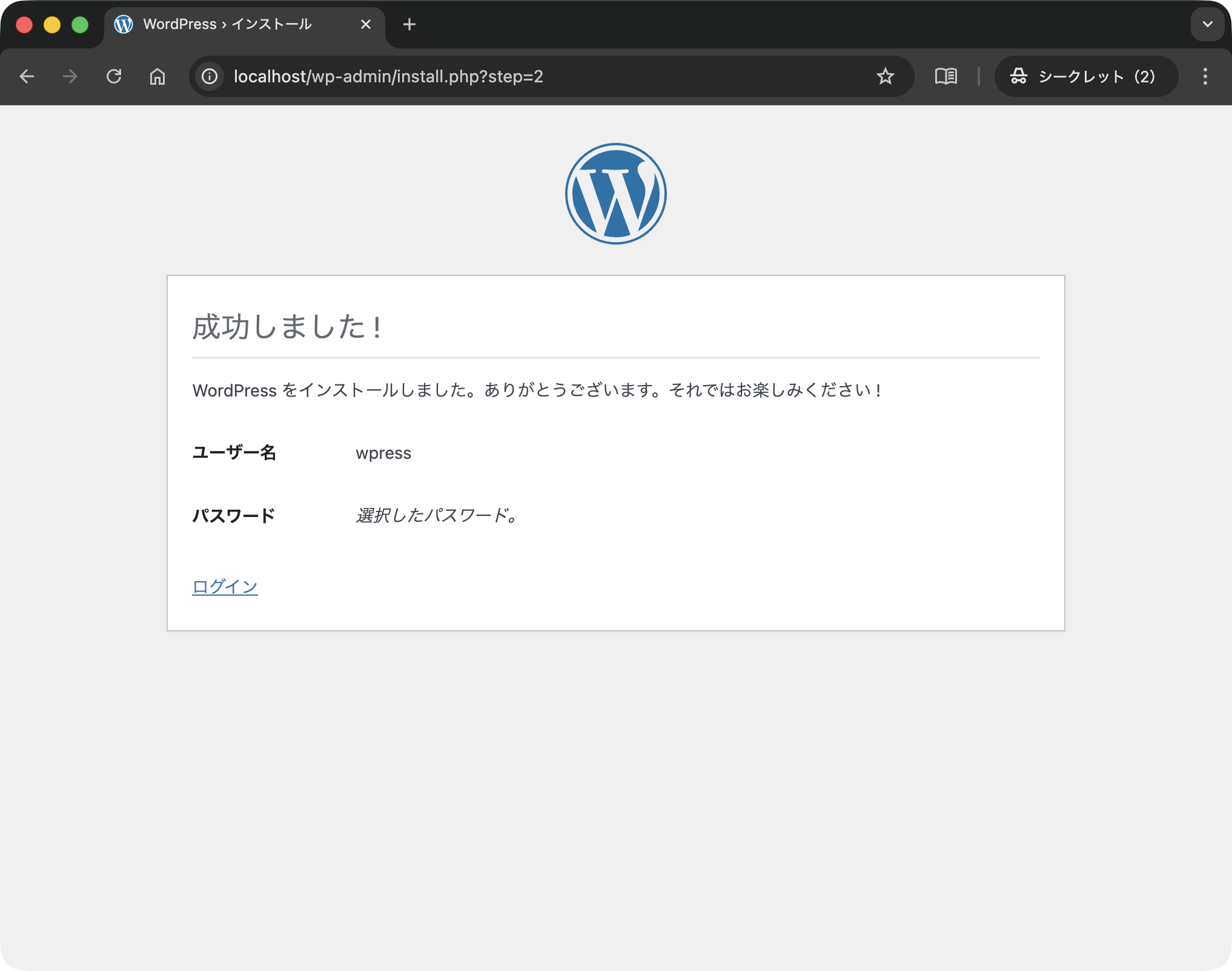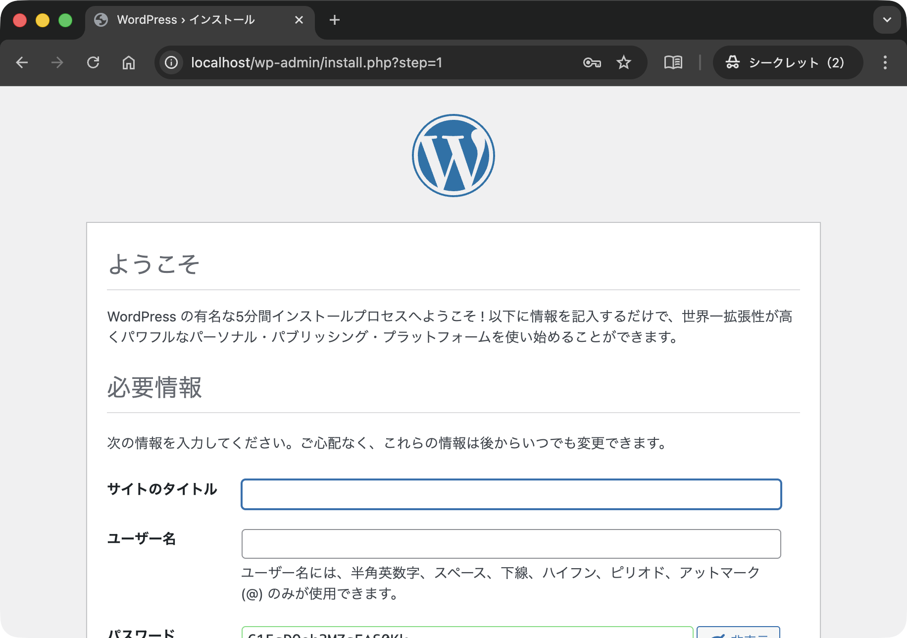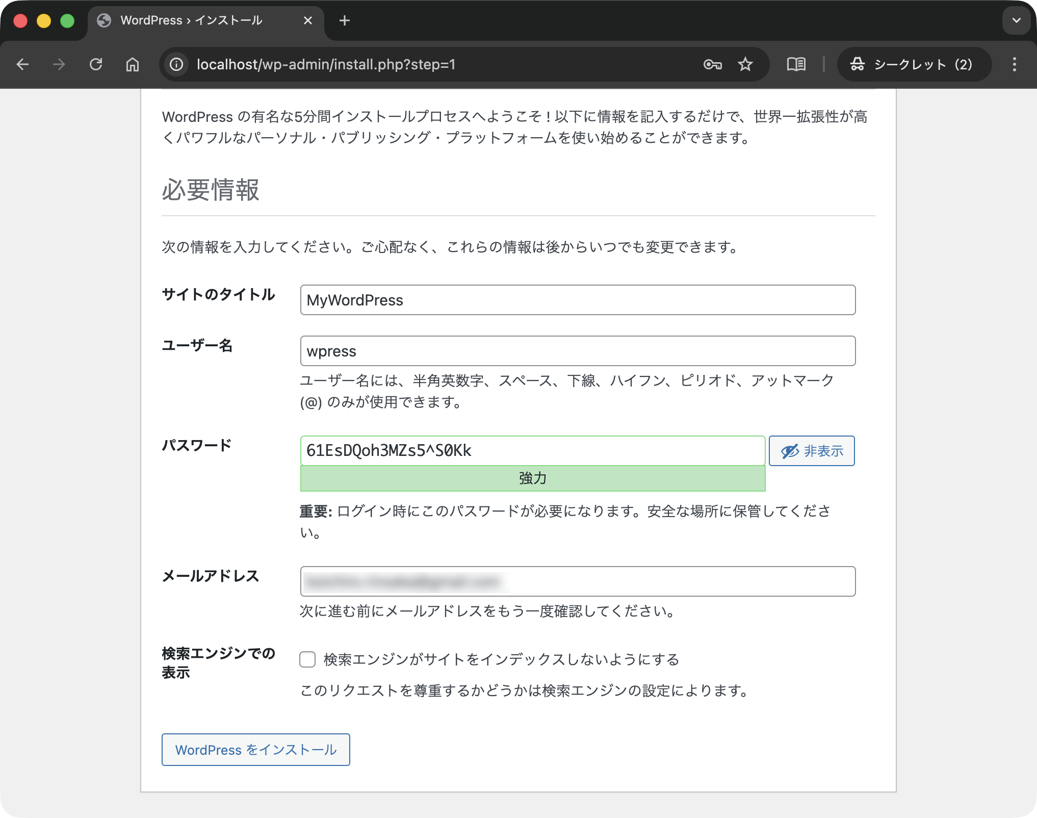 設定を進めます.このとき,パスワードはどこかに控えておくようにしてください.その後「WordPressをインストール」ボタンをクリックします.