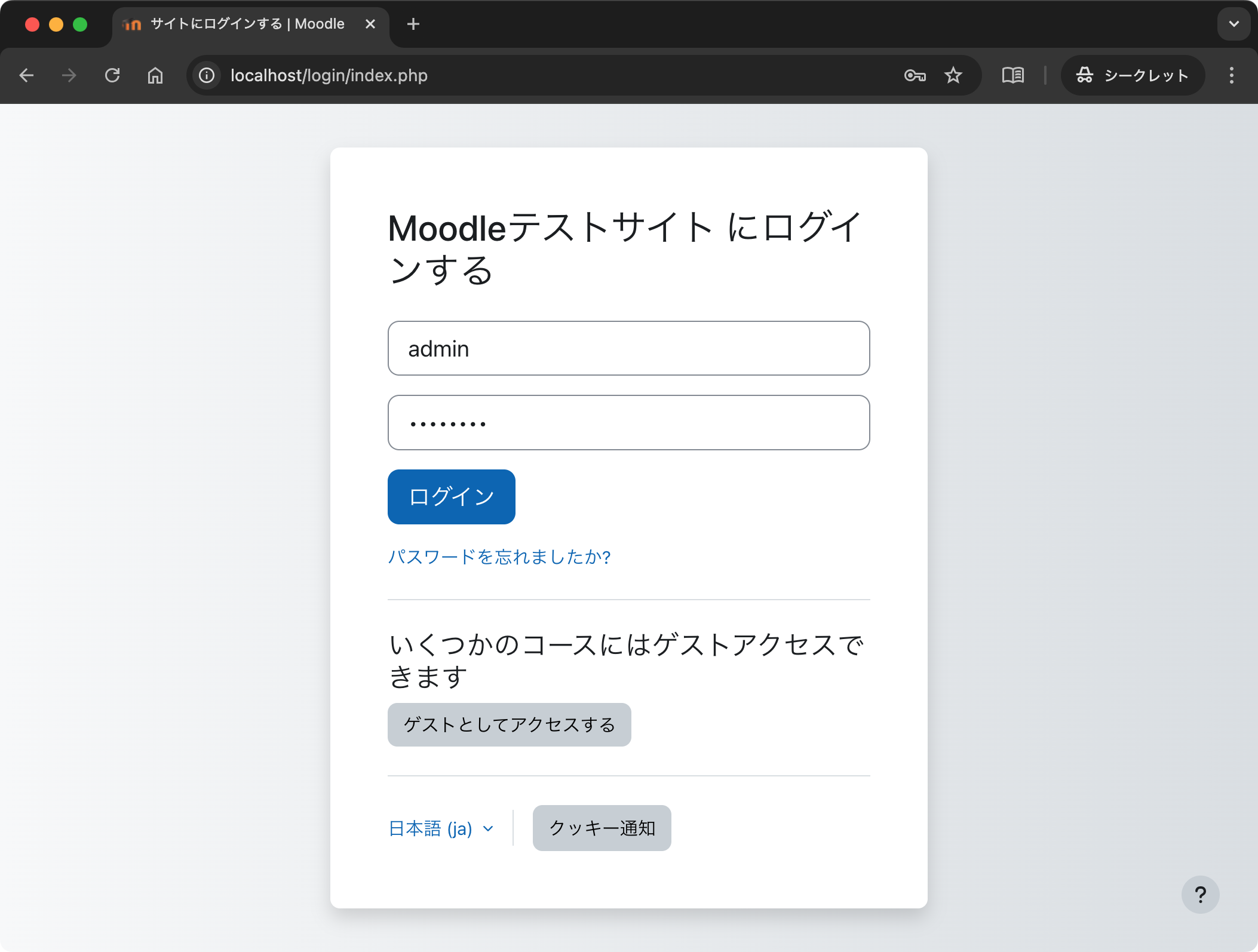 Moodle のインストール時の(20), (21) で設定した「管理者アカウントユーザ名」と「管理者パスワード」を使ってログインします.