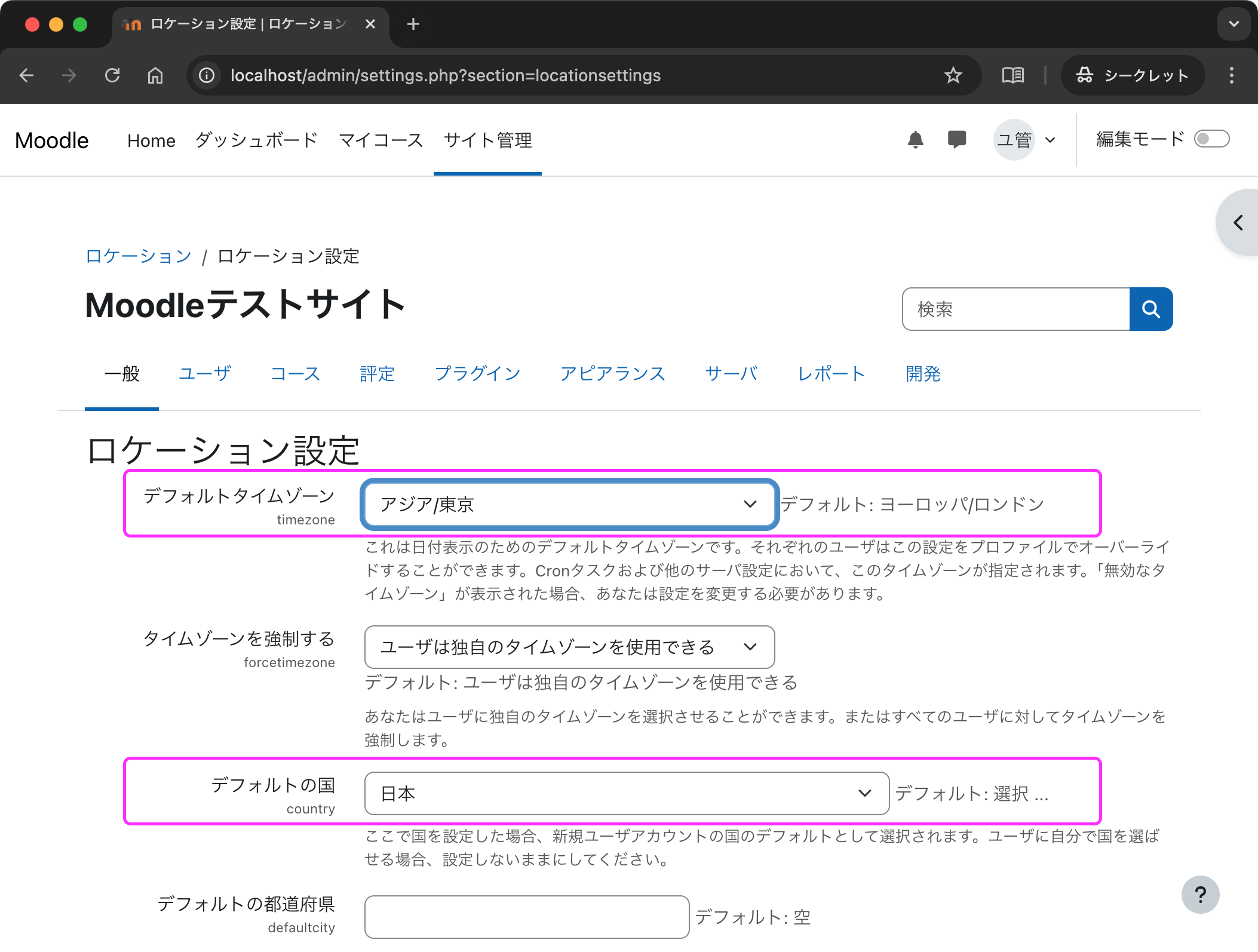 Moodle に管理者 (ユーザID: admin) でログインした後,次の図のとおり「サイト管理」→「一般」→「ロケーション」→「ロケーション設定」を開きます.そこで,デフォルトタイムゾーンを「アジア/東京」に変更し,デフォルトの国には「日本」を選びます.最後に「設定を保存する」ボタンを押します.