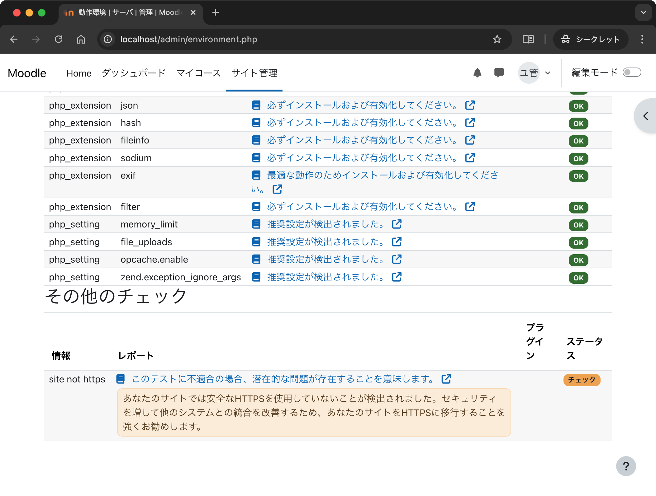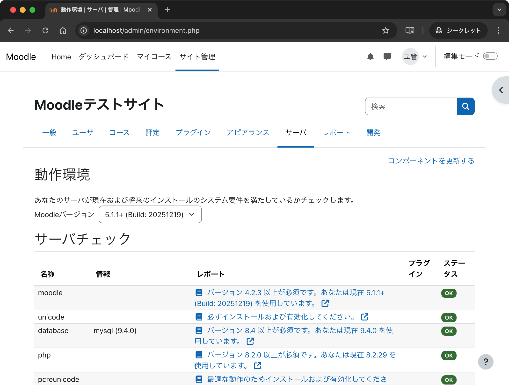 次に「サイト管理」→「サーバ」→「動作環境」を開きます.すでに,コンテナ構築時に docker-compose.yml や php/Dockerfile には Moodle の動作に最低限必要な設定がなされているので,ステータスはほとんどが「OK」になっているはずです.