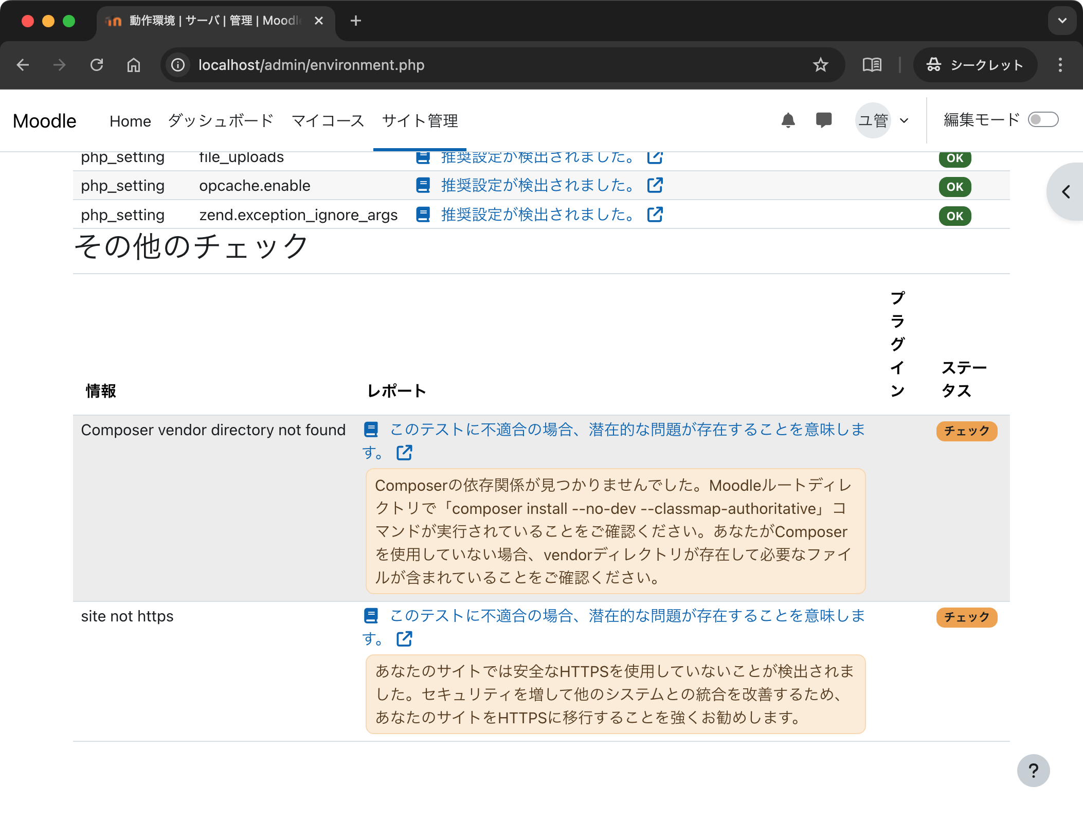 コマンド実行後に同じページを再読み込みすると,「チェック」となっていた項目がひとつなくなりました.なお,「site note https」という「チェック」項目はローカルのテスト環境であれば無視して問題ありません.本番環境では https を利用すべきです.