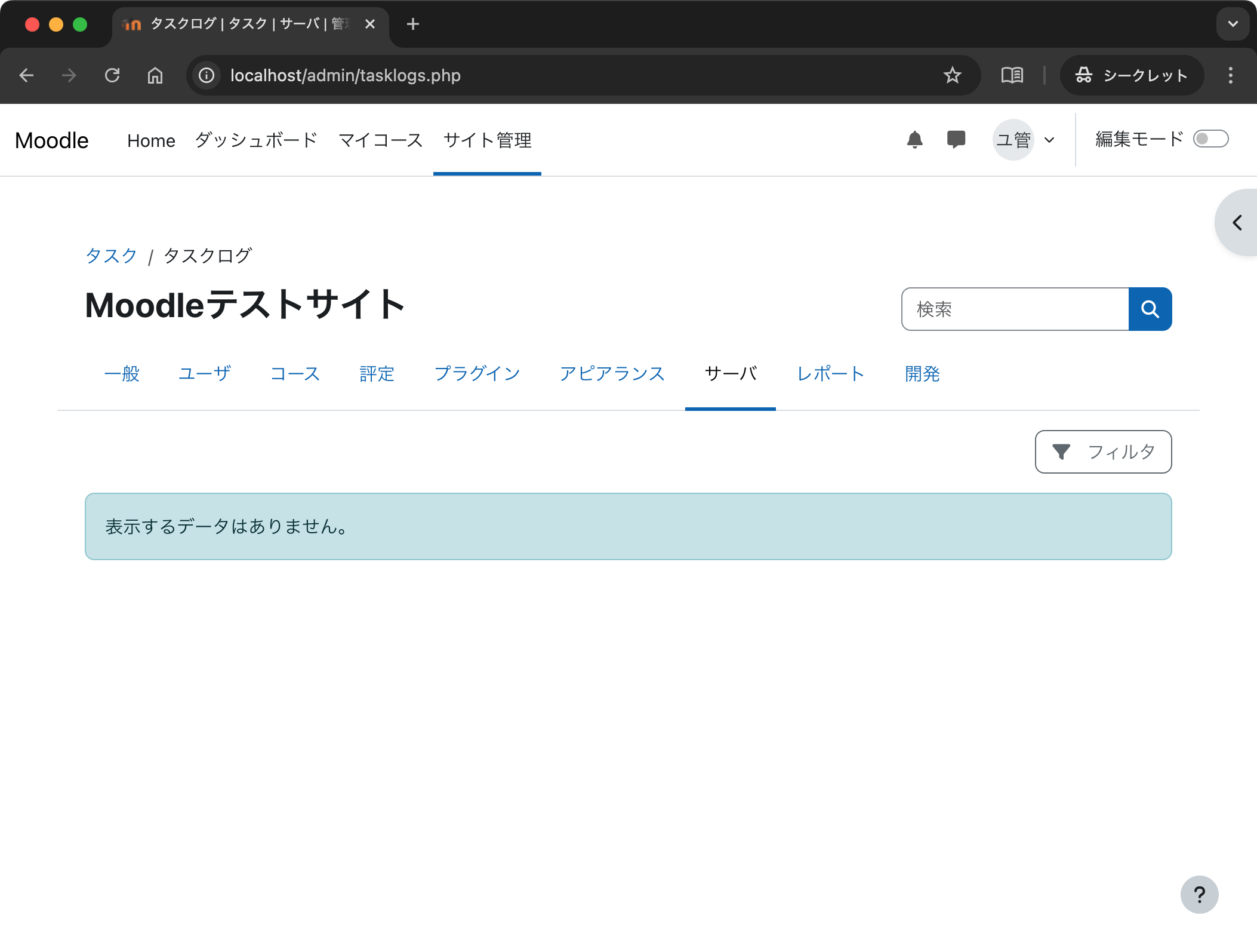 「サイト管理」→「サーバ」→「タスク」→「タスクログ」を開くと,次のとおり,まだ実行されたタスクがないことも確認できました.