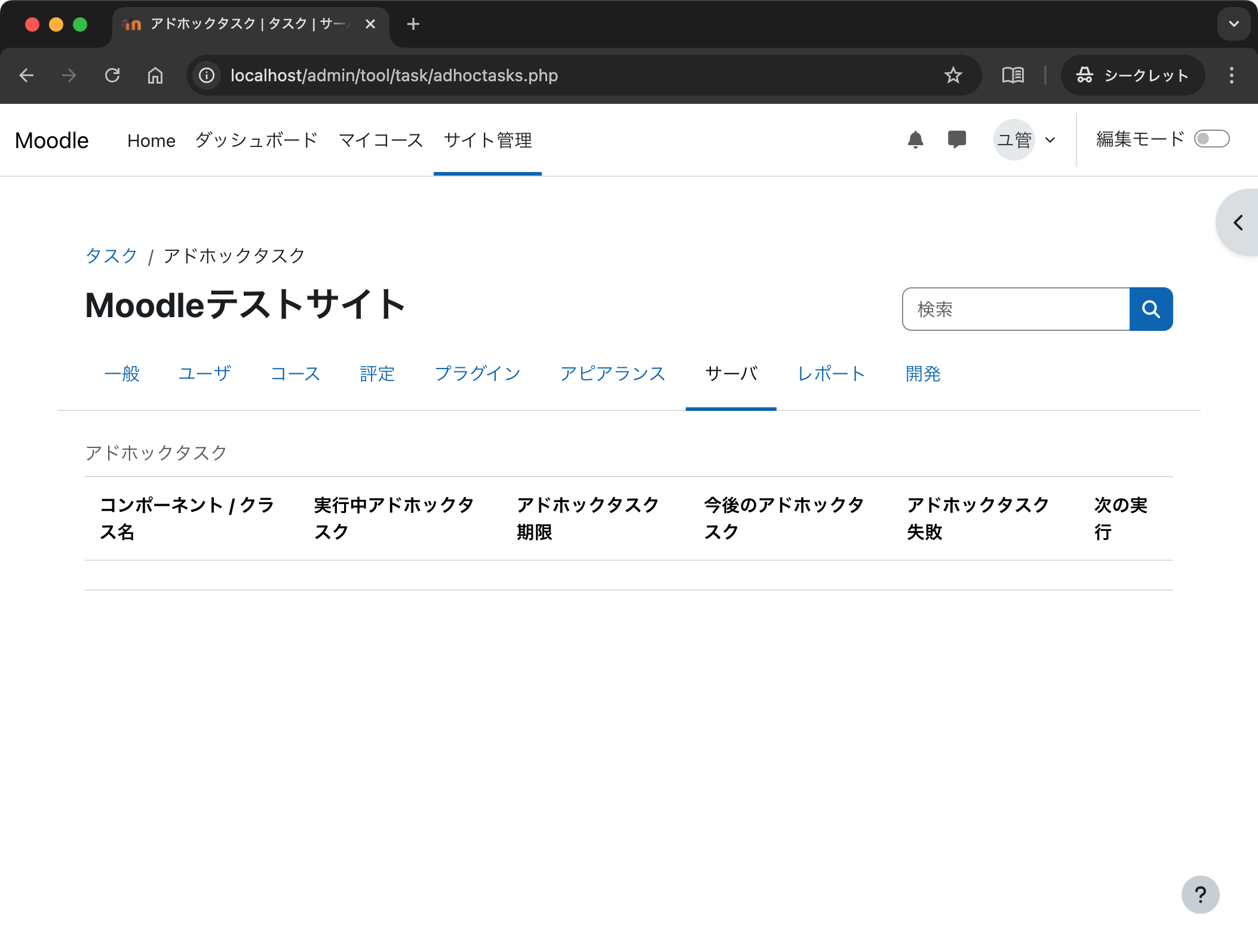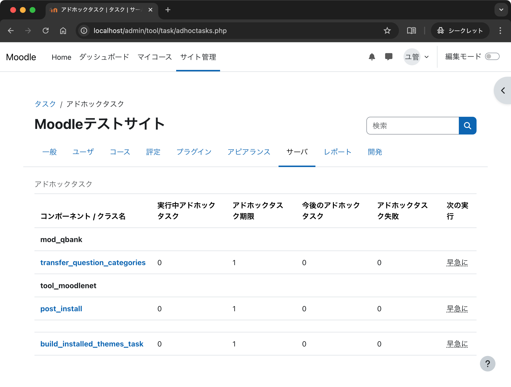 上の作業が終われば,「次の実行」が「早急に」となっていたタスクがなくなりました.これで小テストに問題が追加できるようになります.開発環境ではときどきアドホックタスクを確認して,「早急に」というタスクがあれば上のコマンドを実行する程度で良いでしょう.また実行しなければ,「小テストや課題の期限の通知,小テストや課題採点後のフィードバック通知」などが送信されません.実際に「学生が課題に提出する」,「教員が課題を採点し,学生に結果を通知する」という作業を行っても学生には通知が届かないことを確認してください.その後,cron.php を手動実行したタイミングで学生に通知が届くことを確認するとこの処理の意味合いを理解できることでしょう.