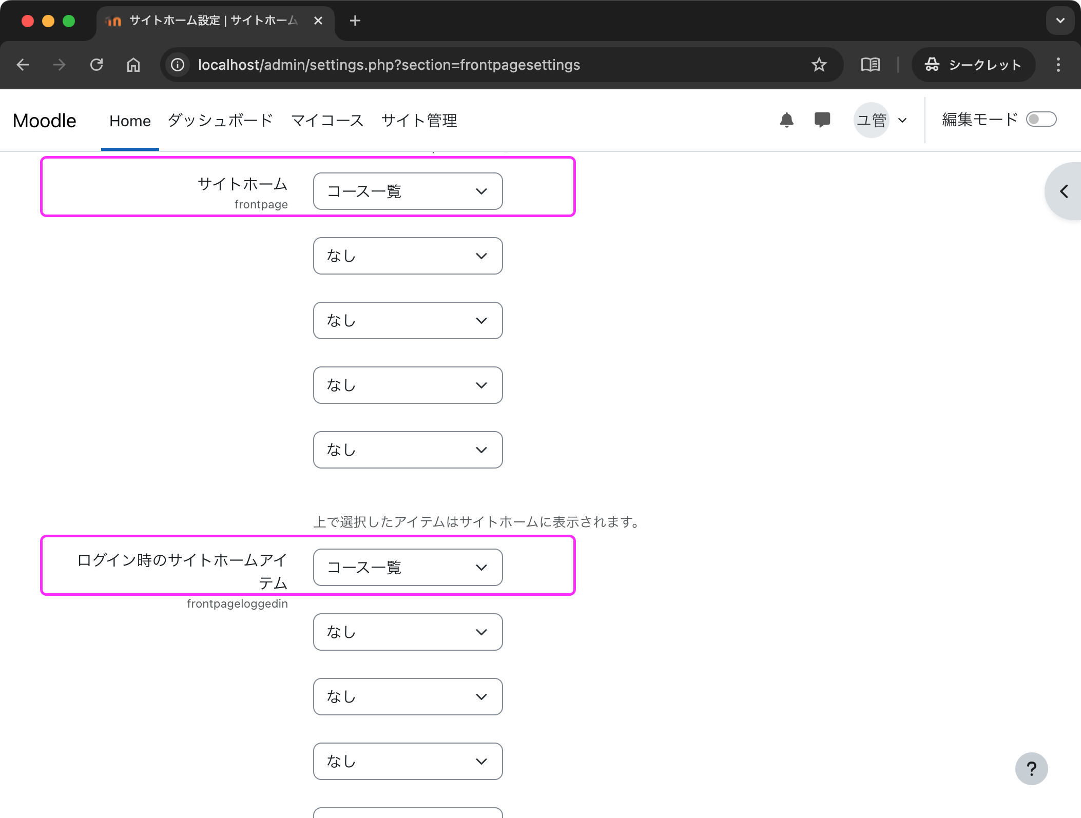 「サイト管理」→「一般」→「サイトホーム設定」を開きます.「サイトホーム」と「ログイン時のサイトホームアイテム」に「コース一覧」が設定されています.