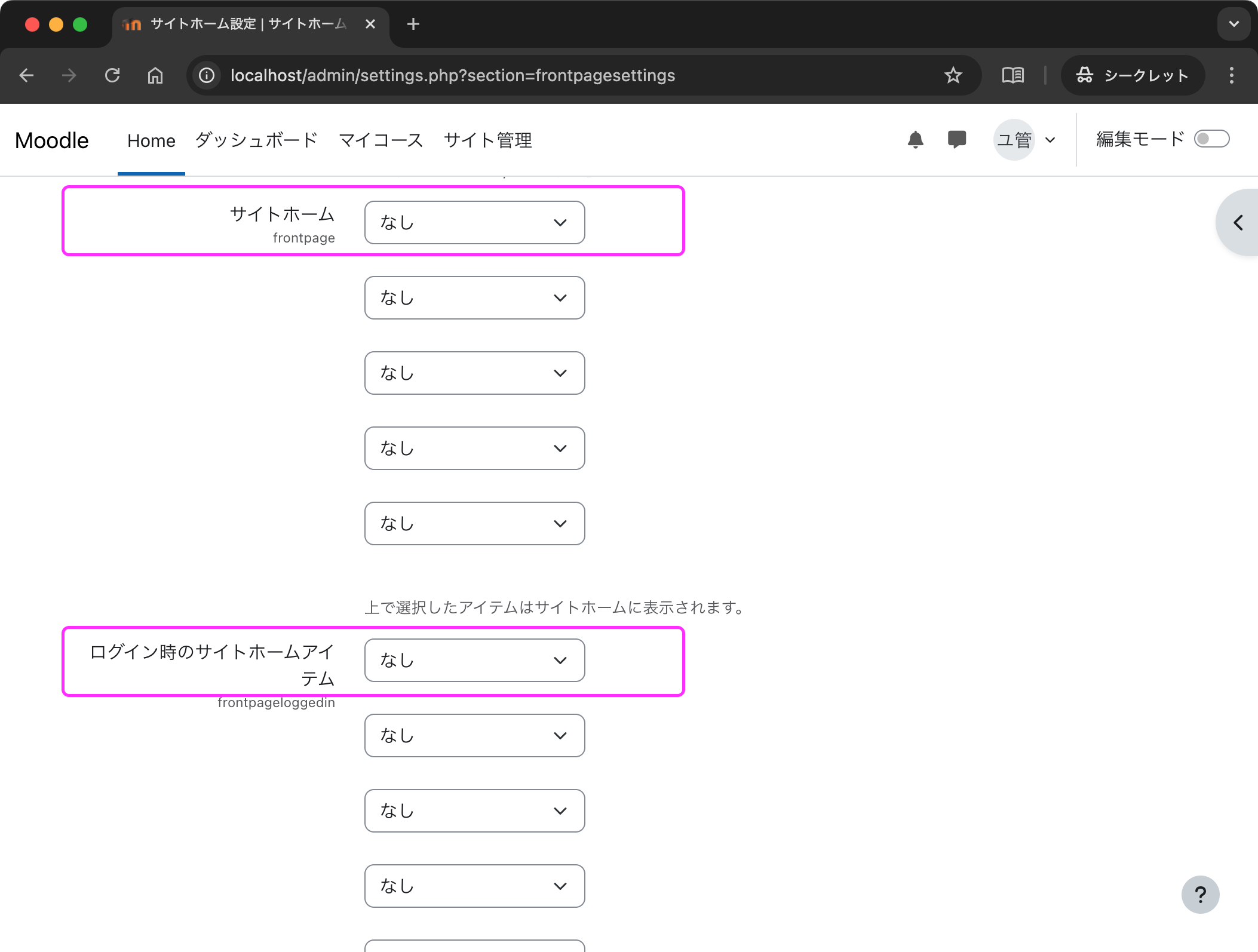 この後の作業で,管理者がコース(講義科目)を追加します.標準の設定ではログイン前のユーザにコースの一覧が表示されてしまいます.また,ログイン後にも所属していないコース(つまり,履修していない講義科目)が表示されてしまいます.ここではサイトホーム設定でコースの一覧が表示されないようにします.