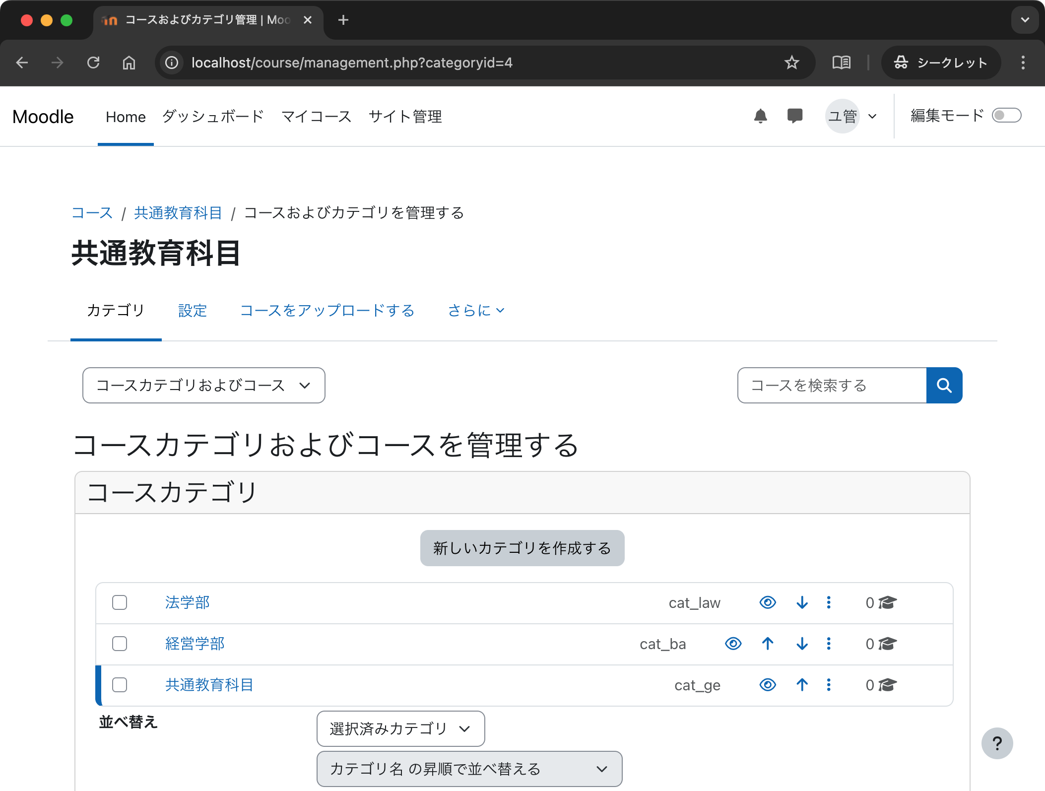管理者(ユーザ名: admin)でログインし,「サイト管理」→「コース」→「コースおよびカテゴリを管理する」を開きます.