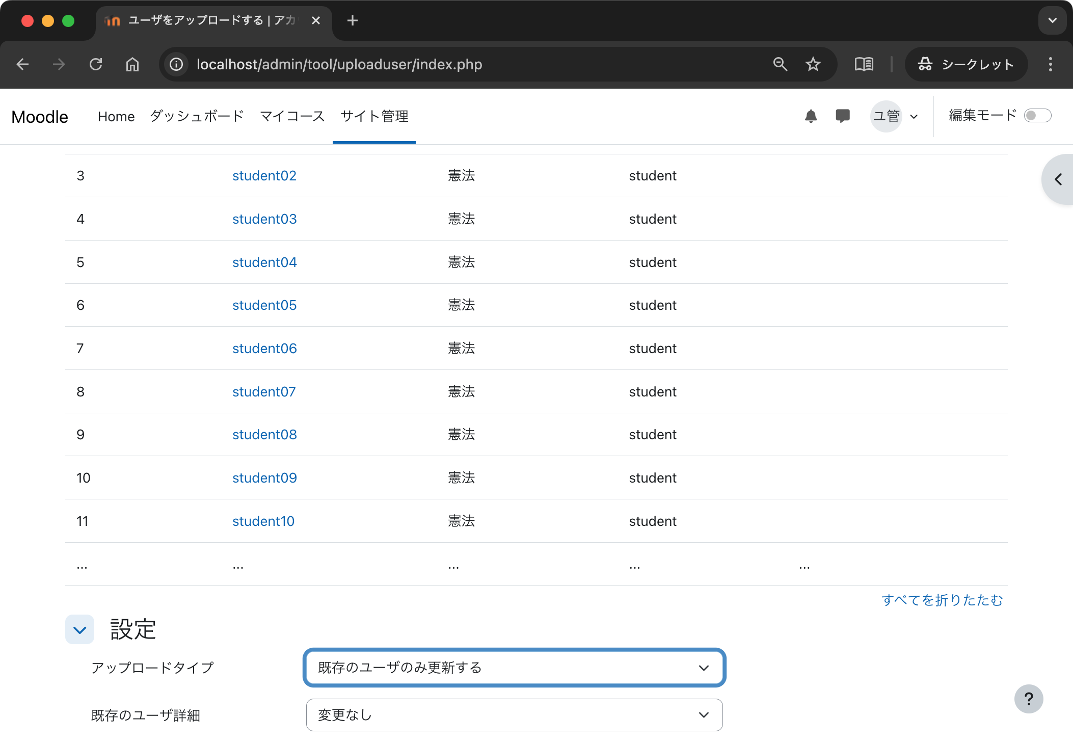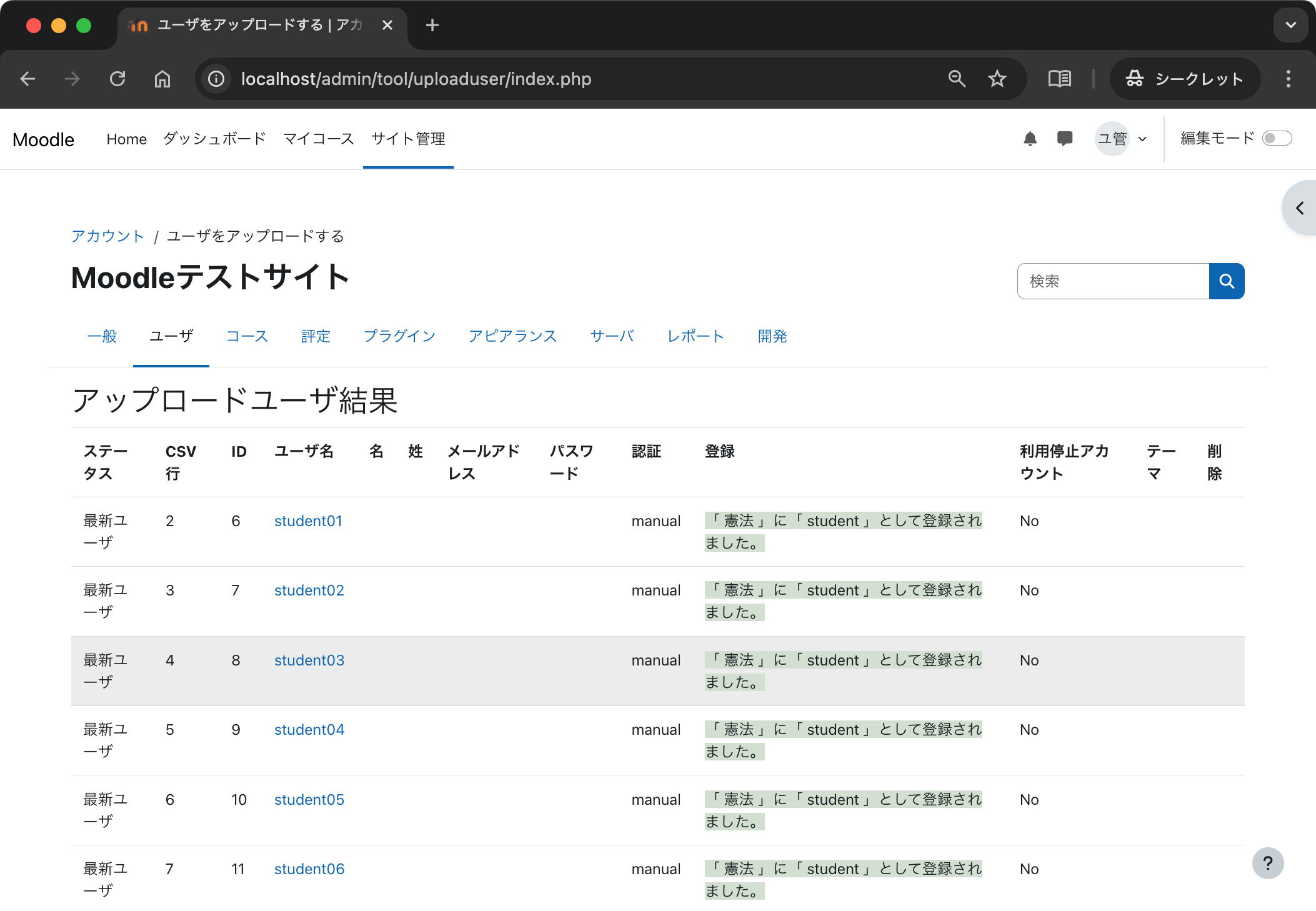 CSV ファイルが準備できたら,やはり「サイト管理」→「ユーザ」→「アカウント」→「ユーザをアップロードする」から CSV ファイルを登録します.