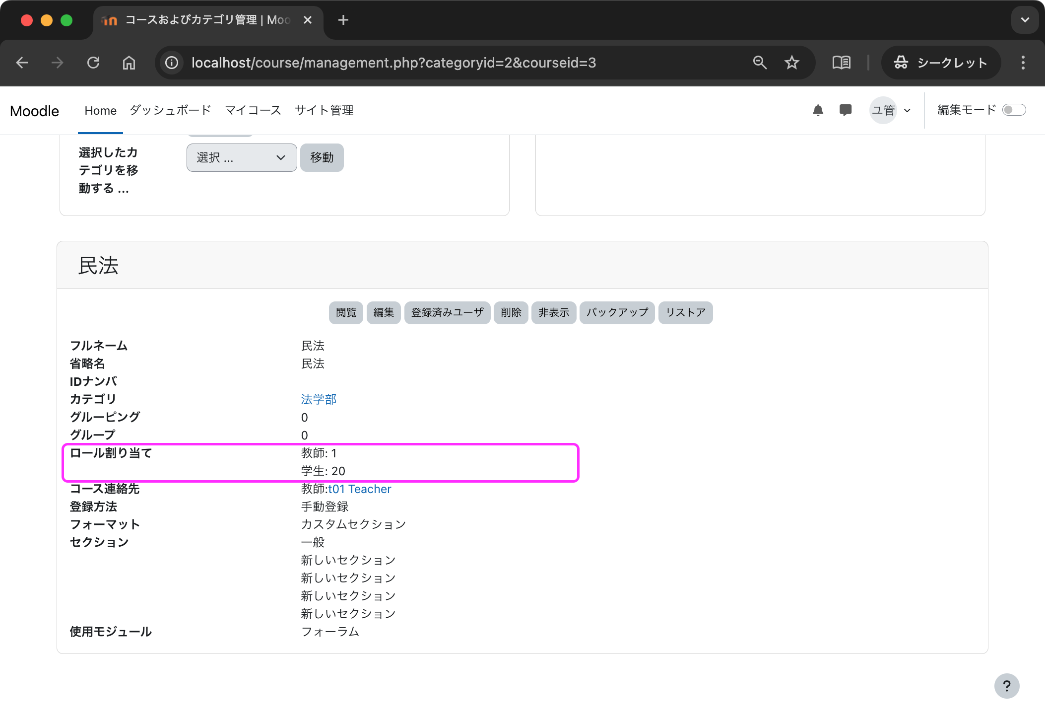 次のとおり,「サイト管理」→「コース」→「コースおよびカテゴリを管理する」から1つの科目(今回は民法)を選びます.教師1名に加えて,新たに20名の学生ロールが割り当てられていることが確認できました.その他のコースについても確認すると良いでしょう.
